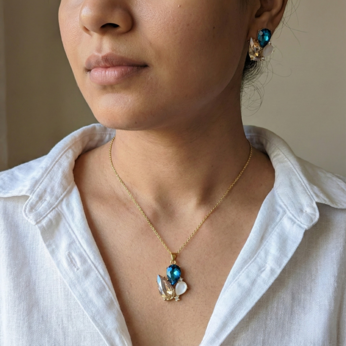 Elegant Blue Crystal & Pearl Pendant Set with Matching Stud Earrings