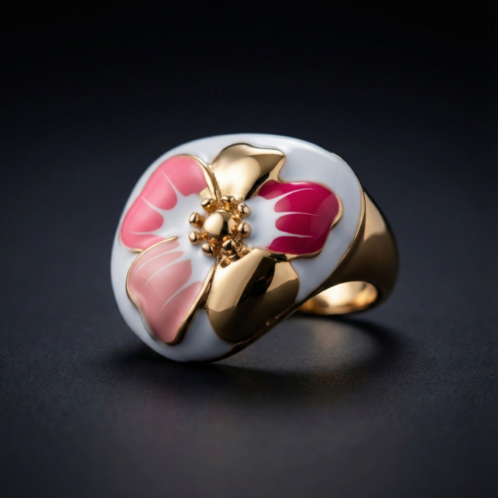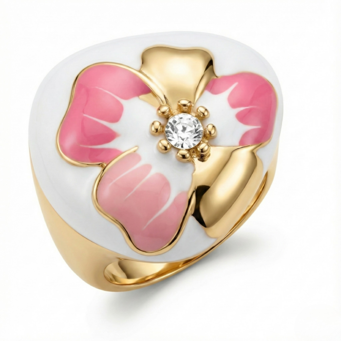 Be the first to review “Floral Enamel Gold-Tone Statement Ring with Crystal Center | Pink & White Flower Design | Elegant Designer Ring for Women”