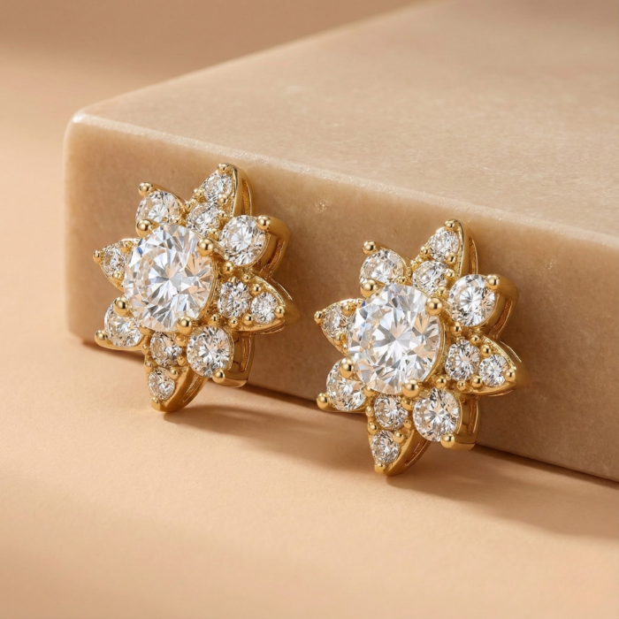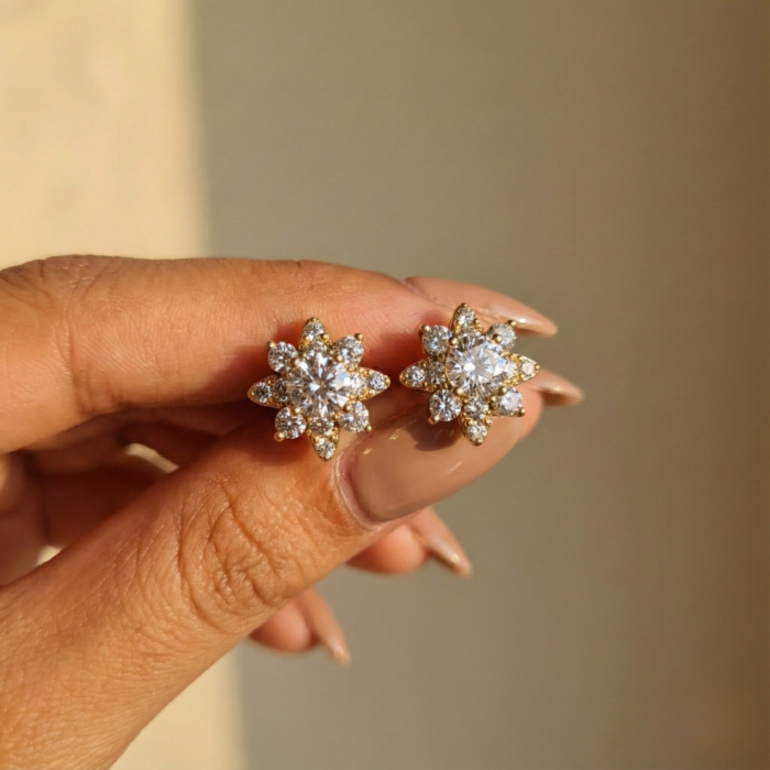 Gold Tone Crystal Snowflake Stud Earrings – Cubic Zirconia Starburst Floral Post Earrings – Dainty Elegant Bridal Wedding Jewelry Gift for Women