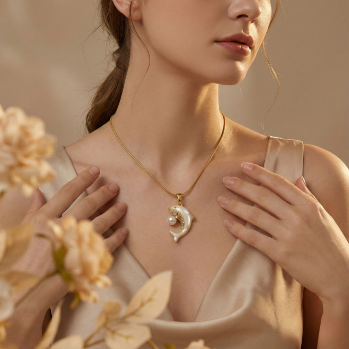 Be the first to review “Gold Tone Dolphin Pendant Necklace – Mother of Pearl Look with Crystal Accents & Round Pearl Charm – Playful Ocean Themed Jewelry”
