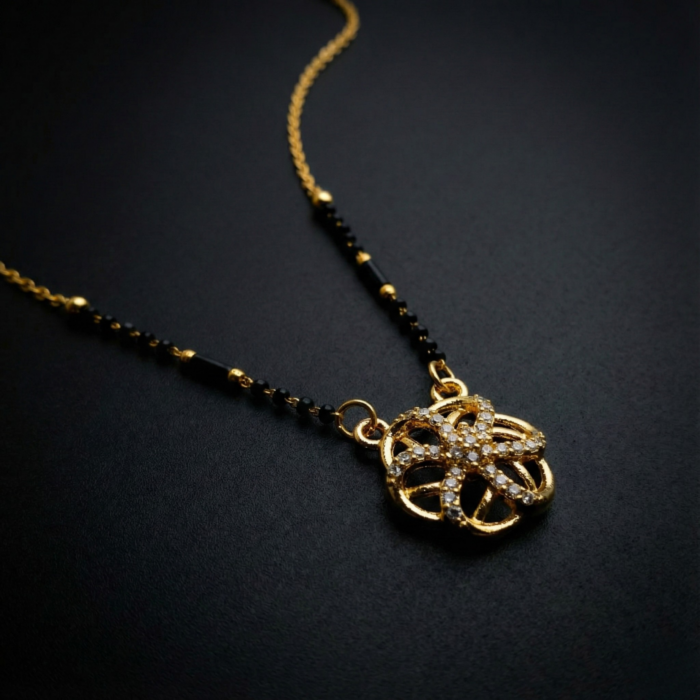 Gold Tone Short Mangalsutra Necklace – Crystal Floral Pendant with Traditional Black Beads Chain – Modern Daily Wear Jewelry for Women