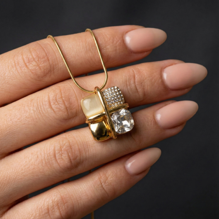 Modern Gold Plated Geometric Square Pendant Necklace | Mixed Stone Design with Crystal, Cat Eye & Pave Accents | Art Deco Style Statement Jewelry