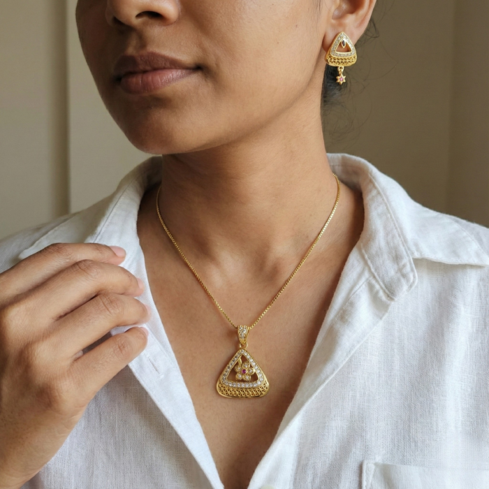 Traditional Triangle Gold-Tone Pendant & Earrings Combo Set with Red Stone | Crystal-Studded Geometric Ethnic Jewelry Set for Women