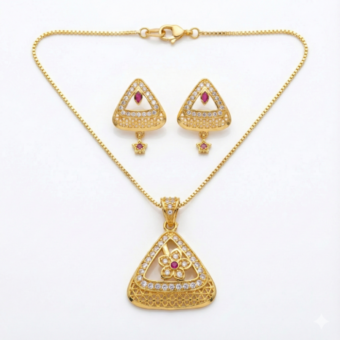Be the first to review “Traditional Triangle Gold-Tone Pendant & Earrings Combo Set with Red Stone | Crystal-Studded Geometric Ethnic Jewelry Set for Women”